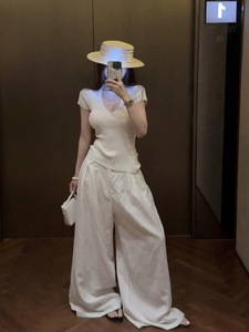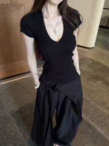 黑色深V领坑条高弹针织纯欲收腰显瘦2025夏季短袖T恤女短款上衣女