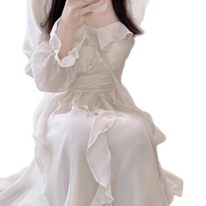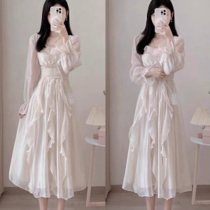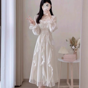 法式杏色温柔方领荷叶连衣裙2025年春秋气质高级小个子超仙长裙女
