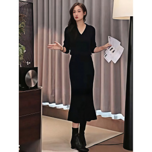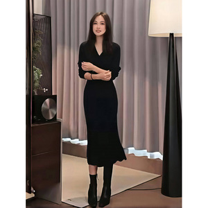 7628聚光灯针织连衣裙 红毯女神!V领收腰鱼尾裙