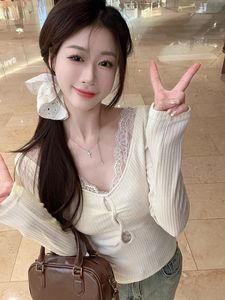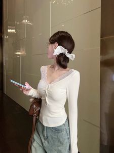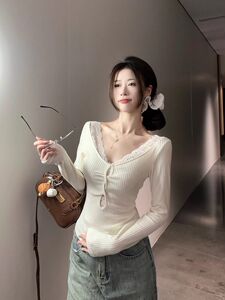【3×1螺纹德绒240克】辣妹蕾丝拼接镂空短款打底衫上衣