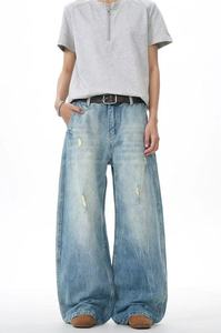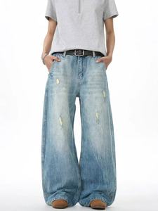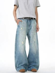 美式复古裂纹破洞水洗牛仔裤男女宽松阔腿vintage情侣直筒裤子潮
