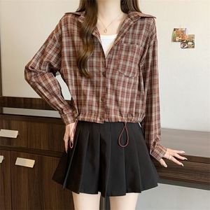 复古外穿秋格子抽绳收腰短款长袖衬衫女外搭遮肉春秋显瘦宽松外套