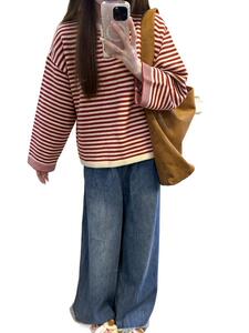 慵懒感红色条纹撞色针织上衣秋季穿搭宽松毛衣女秋冬2025新款百搭