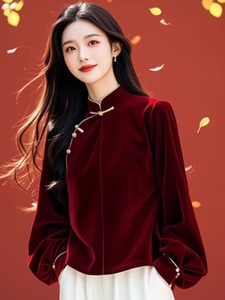 新中式红色丝绒衬衫好捍秋季轻国风盘扣斜襟衬衣高级感灯笼袖上衣
