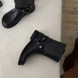羊皮版~牛皮时装靴复古黑色机车靴女低跟西部靴子套筒皮带扣短靴
