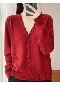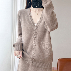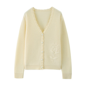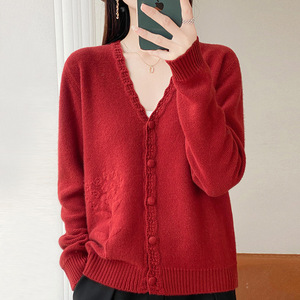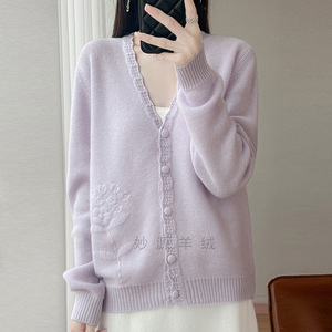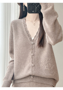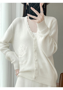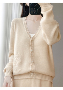 新款减龄V领羊毛开衫花边包扣提花毛衣 针织外套提花小香风羊毛衫