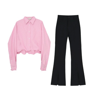 时尚减龄套装女早秋季粉色长袖衬衫上衣垂感开叉休闲裤