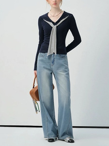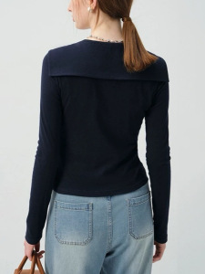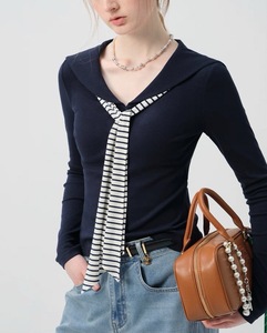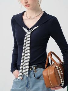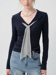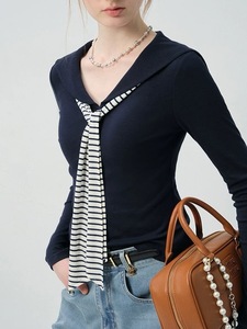 VEGA 长袖T恤女2025新款秋季学院风海军领条纹飘带修身上衣