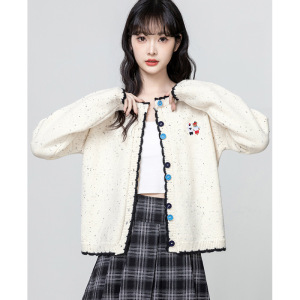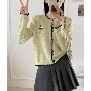 韩系复古撞色圆领针织开衫女2025春秋季新款宽松短款毛衣外套上衣