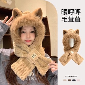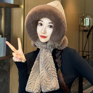 毛绒绒狐狸耳朵帽子女冬季保暖围脖防寒冬天护耳围巾一体帽二件套