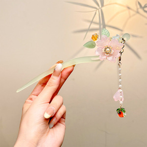74#玉兔粉花流苏发簪-金色 (袋装)