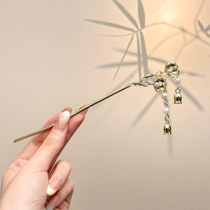 96#白玉兰花双花流苏发簪-金色 (袋装)