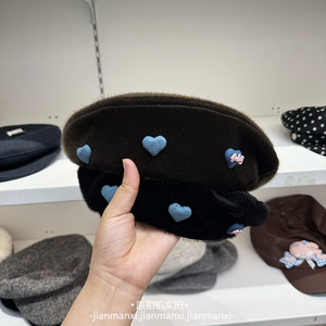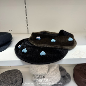 2025新款复古爱心毛茸茸八角贝雷帽子女韩版百搭显脸小平顶蓓蕾帽