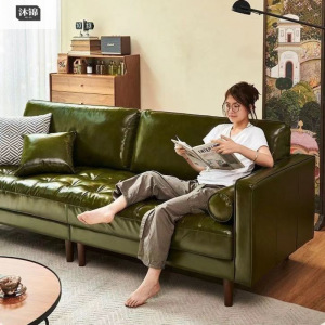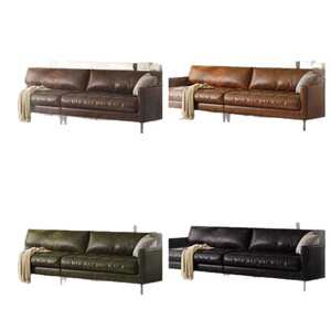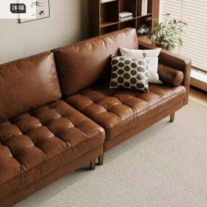 中古风沙发小户型简约直排三人焦糖色真皮沙发客厅法式复古油蜡皮