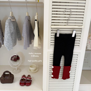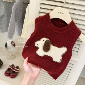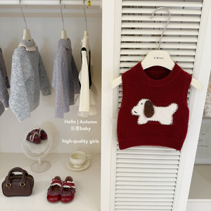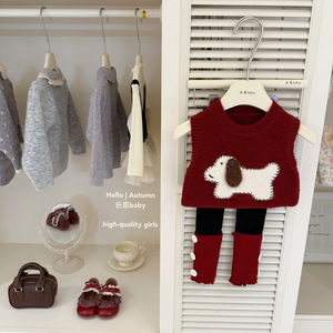 【乐恩童装】原创设计秋冬女童红色小狗马甲黑拼红针织裤洋气套装