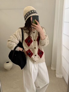 圆领菱格毛衣外套女秋冬高级感开衫慵懒风时尚上衣G1485