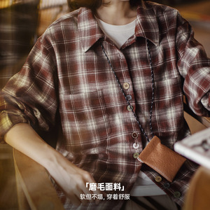 马登美拉德棕咖色系磨毛格子纹长袖衬衫宽松衬衣外套上衣女士秋季