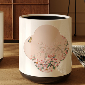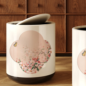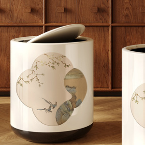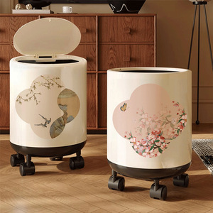 新中式垃圾桶家用2025新款国风高颜值客厅卧室带轮子双层带盖纸篓