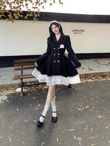 2025年大码学院风蝴蝶结连衣裙女秋季气质裙子胖mm收腰显瘦西装裙