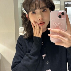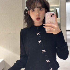 蝴蝶结黑色针织开衫外套女春秋2025新款韩系慵懒风内搭毛衣打底衫
