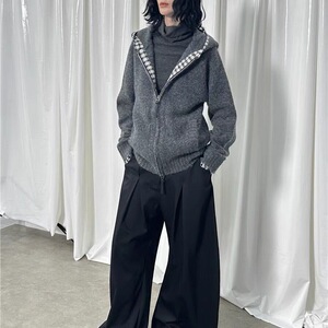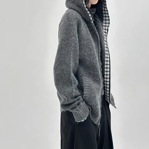 2025秋冬灰色双拉链开衫拼接格纹连帽毛衣外套女宽松上衣气质优雅
