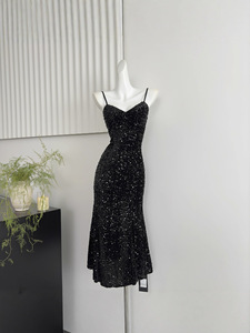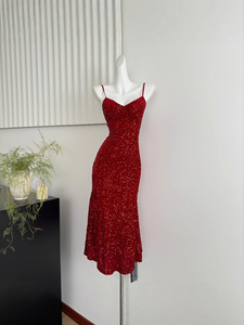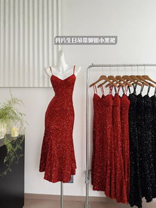 『欣幸』红色丝绒连衣裙女早秋新款亮片生日吊带御姐小黑裙穿搭
