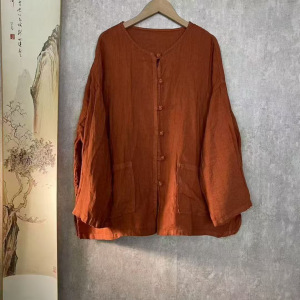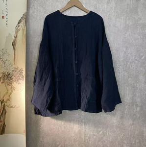 2025秋季文艺复古风砂洗亚麻圆领盘扣贴布口袋衬衫开衫百搭上衣女