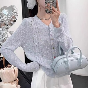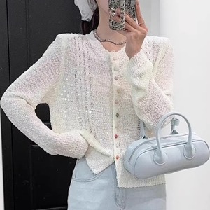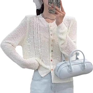 春秋新款韩版宽松显瘦圆领彩扣镂空亮片长袖针织开衫毛衣女外套