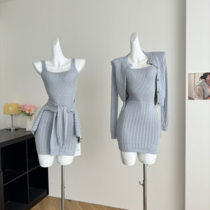 蓝色显白修身初恋裙子千金套装镂空针织开衫包臀收腰连衣裙两件套