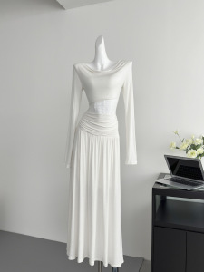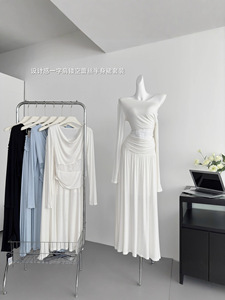 『欣幸』设计感一字肩纯欲镂空蕾丝褶皱打底衫半身裙长裙两件套