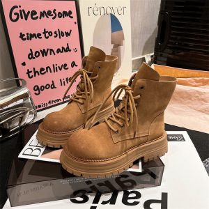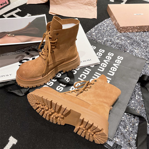 早秋磨砂真皮马丁靴2025年新款字母翻领机车靴大黄靴两穿松糕女鞋