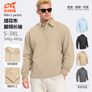 25跨境肌理提花纯色男长袖polo衫外贸亚马逊纽扣新款翻领宽松卫衣