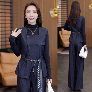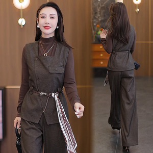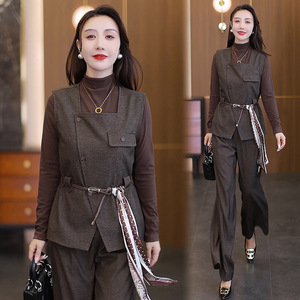 时尚套装女2025秋季新款洋气显瘦气质高腰马甲打底衫阔腿裤三件套