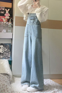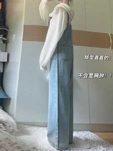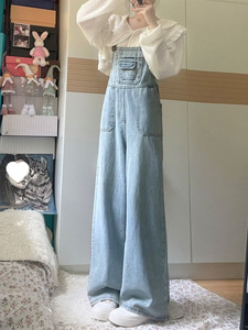 YANBEISI复古减龄阔腿牛仔背带裤女春秋季高腰宽松显瘦直筒连体裤