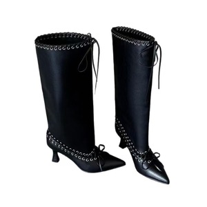 2025欧美外贸新款尖头细跟宽松系带直筒高筒骑士靴女套筒高跟长靴
