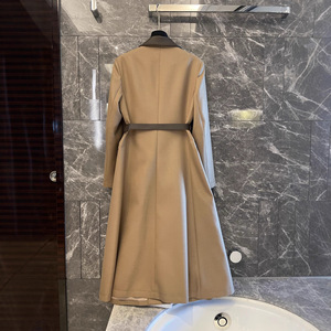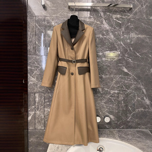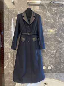 高级感气质秋冬丝羊毛拼接羊皮真皮长袖翻领腰带长款风衣连衣裙