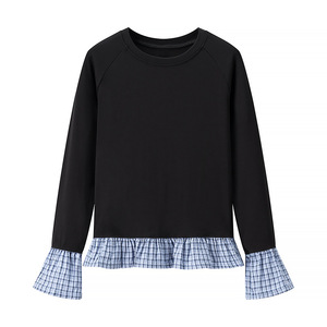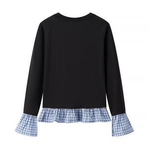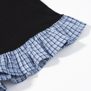 2025秋季款减龄百搭格纹拼接假两件T恤荷叶边喇叭袖别致上衣