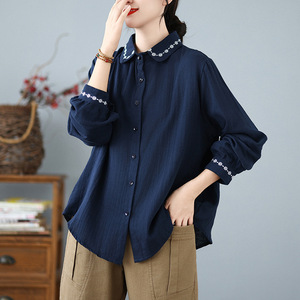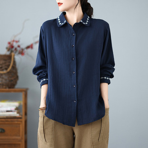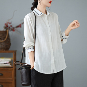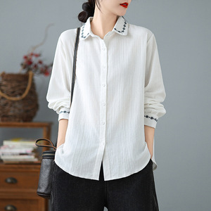 2025秋白色双层棉纱长袖衬衫女宽松文艺百搭刺绣上衣C棉衬衣