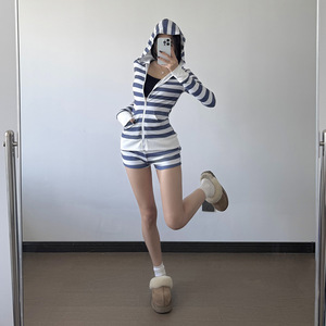 亚马逊欧美休闲风条纹拉链连帽长袖卫衣女运动风修身显瘦百搭外套