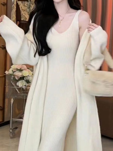 一整套早秋穿搭针织开衫外套秋冬吊带背心裙毛衣裙两件套装连衣裙