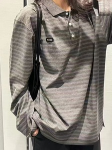现货高版本25早春秋名人同款灰白条纹翻领POLO长袖打底衫贴布元素
