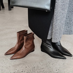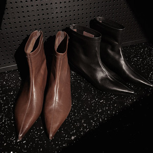 头层牛皮内增高短靴女及裸靴秋冬新开卡真皮尖头中跟后拉链女短靴