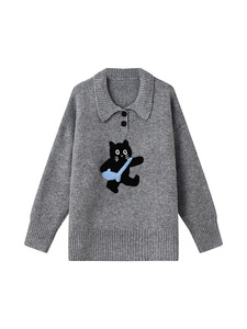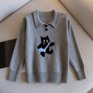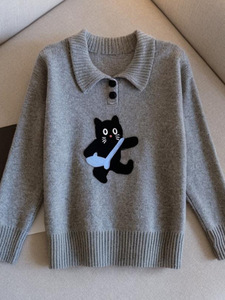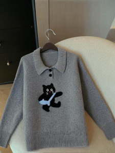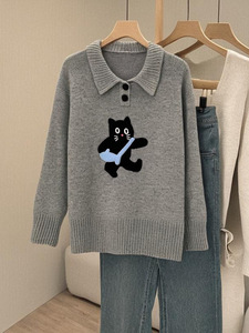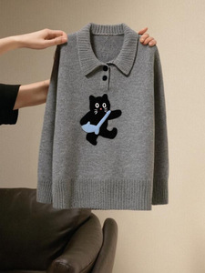 灰色POLO翻领猫咪套头毛衣女秋冬加厚宽松慵懒针织衫外穿春秋