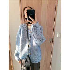 甜美减龄风蓝色圆领长袖针织毛衣开衫女秋季设计感小众宽松上衣