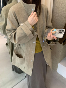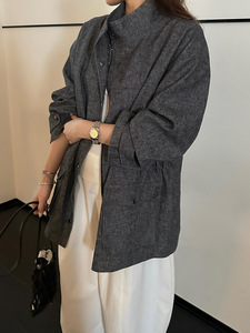 元派bluepops2025秋季新款亚麻棉立领风衣单排扣中长款外套A5678