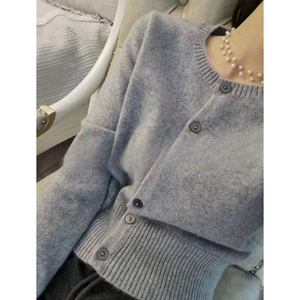 女士100全羊毛开衫秋冬新款圆领高腰短款毛衣外套纯色百搭针织衫