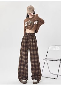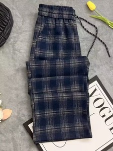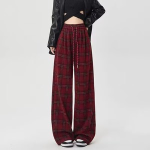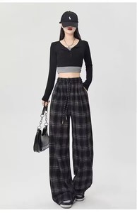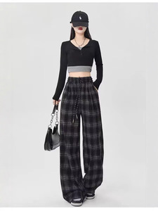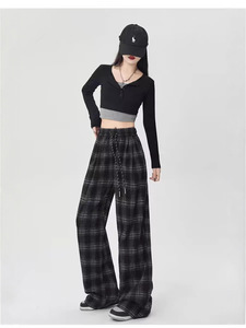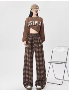 蓝色格子宽松阔腿休闲裤女春秋季2025新款高腰垂感时尚直筒拖地裤