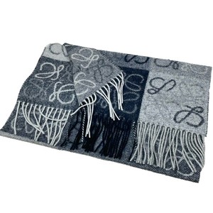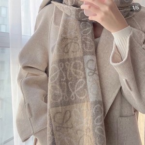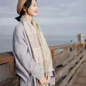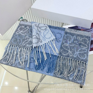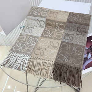 奶茶色棋牌格字母双面羊绒围巾女冰川蓝提花羊毛围脖情侣款男
