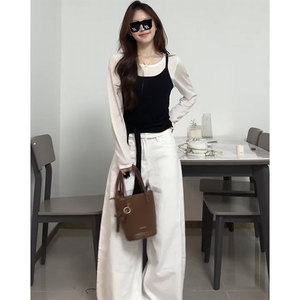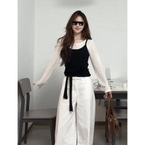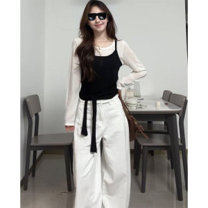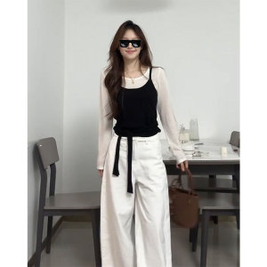 黑白长袖早秋辣妹修身显瘦绑带打底薄款两件套上衣
