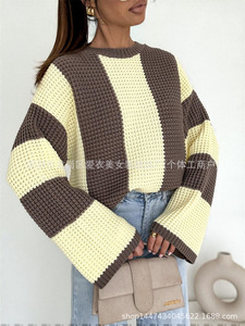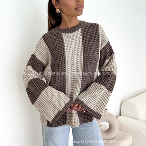 2025wish秋冬女装欧美休闲时尚宽松长袖拼色套头新款毛衣女3色